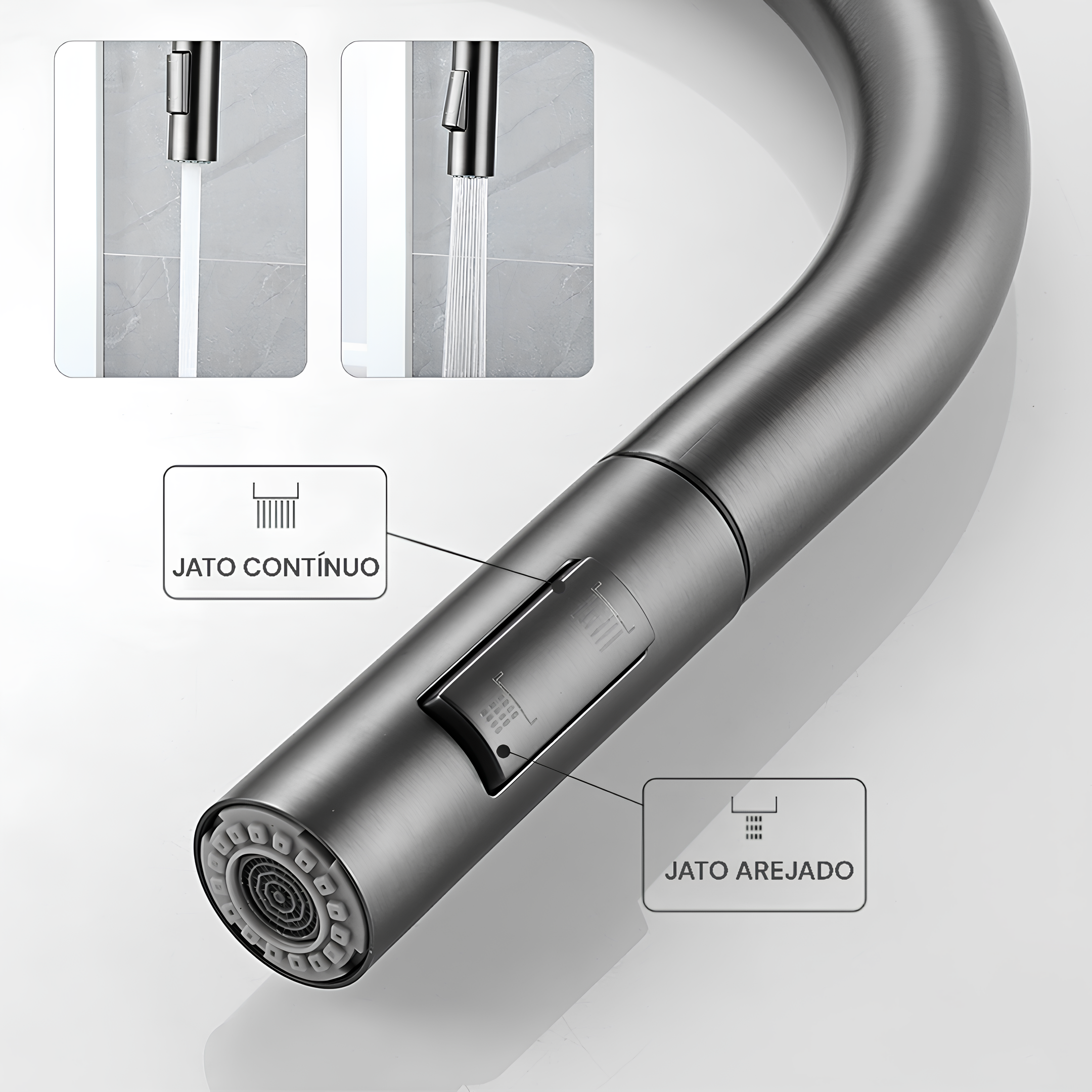 - Duas opções de jato: jato arejado, para maior economia de água e jato ducha para maior pressão e facilidade na limpeza de alimentos e louças;
